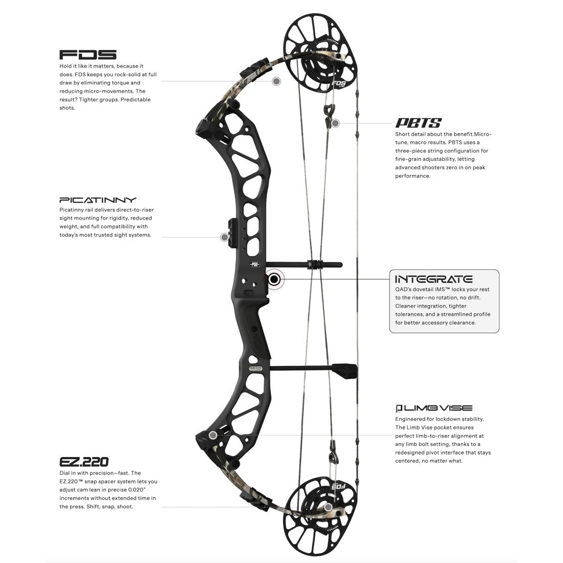 • Montage du repose flèche avec le système Intégrate de QAD évitant ainsi tout risque de perte de réglage.