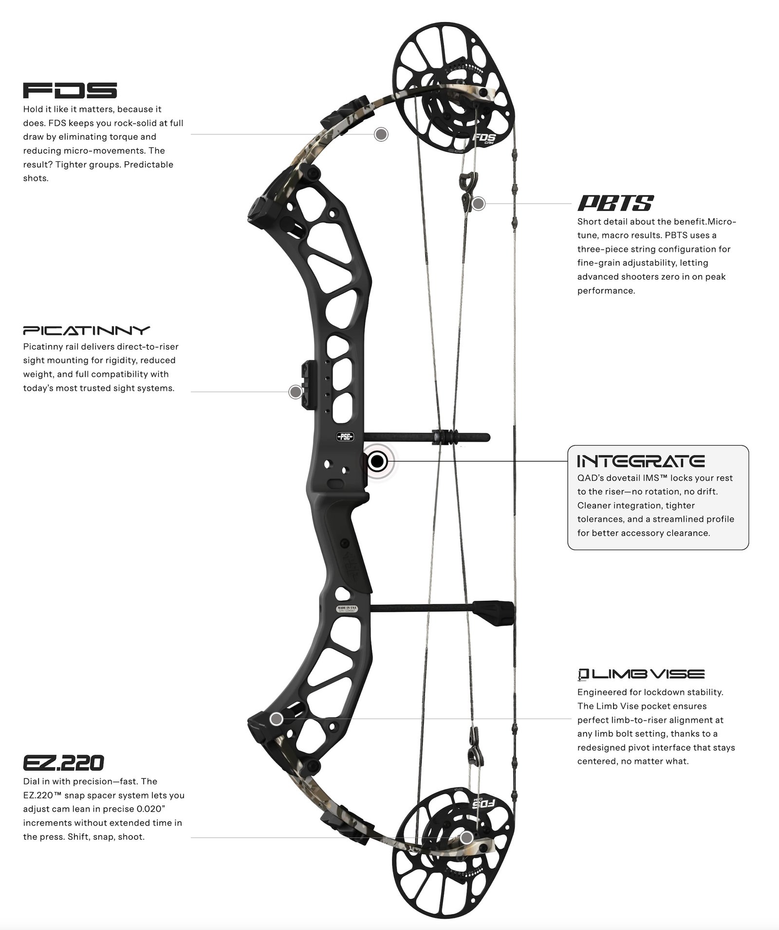 Le Force DS est pourvu du même système de réglage que les arcs haut de gamme de PSE avec le PBTS au niveau de la séparation des câbles ainsi que le système EZ220 pour l'ajustement du lean de la came.