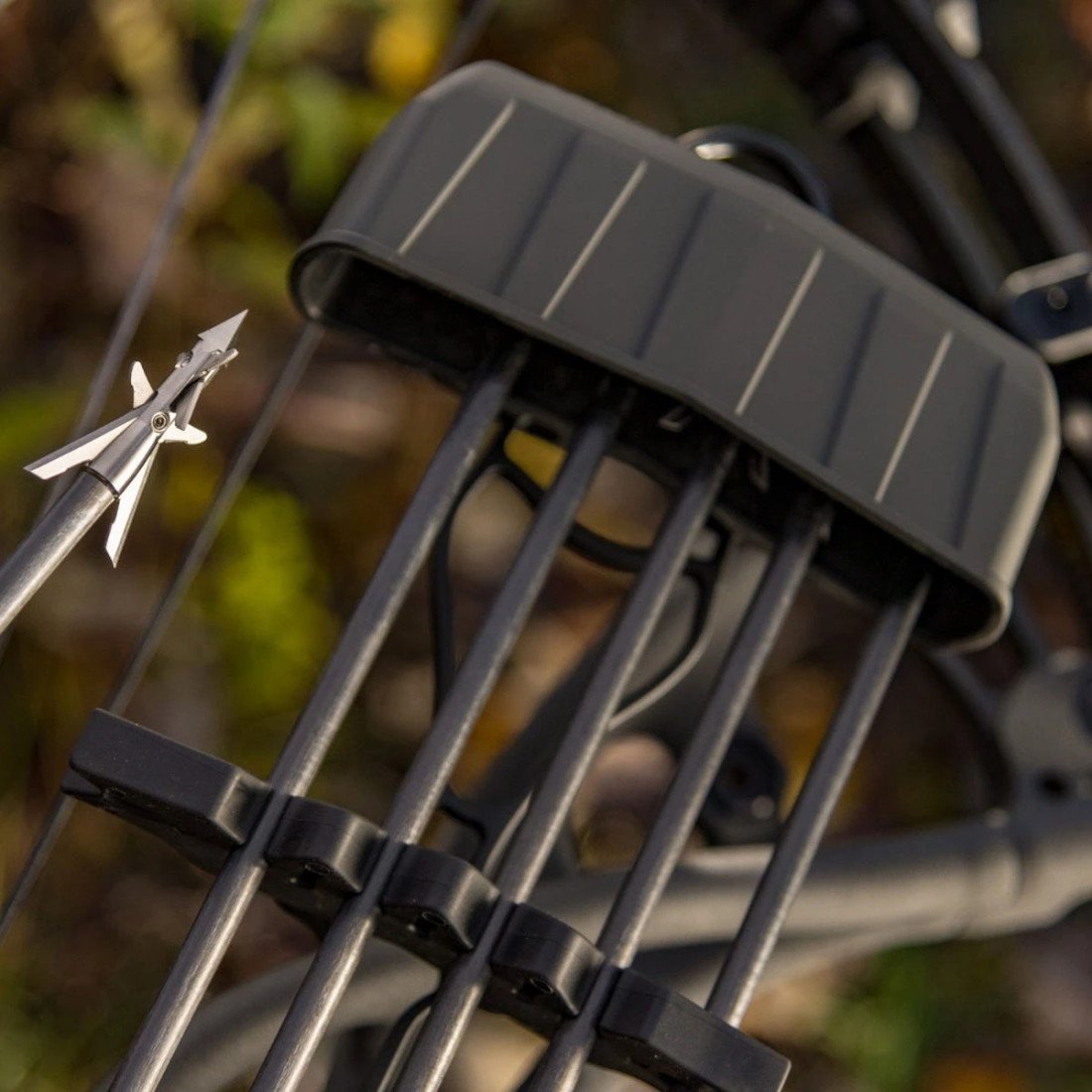 Le carquois peut accueillir jusqu’à 6 flèches carbone ou aluminium, avec un maintien efficace grâce à sa structure robuste. Il est compatible avec des flèches de diamètre .229" et plus, ainsi qu’avec les pointes fixes et mécaniques.
