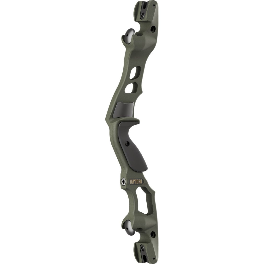 La poignée Satori permet d'ajuster le center shot de l'arc grâce à son système unique d'ajustement par plaque. Il est également possible de l'enlever et de tirer tout simplement avec un repose flèche classique.